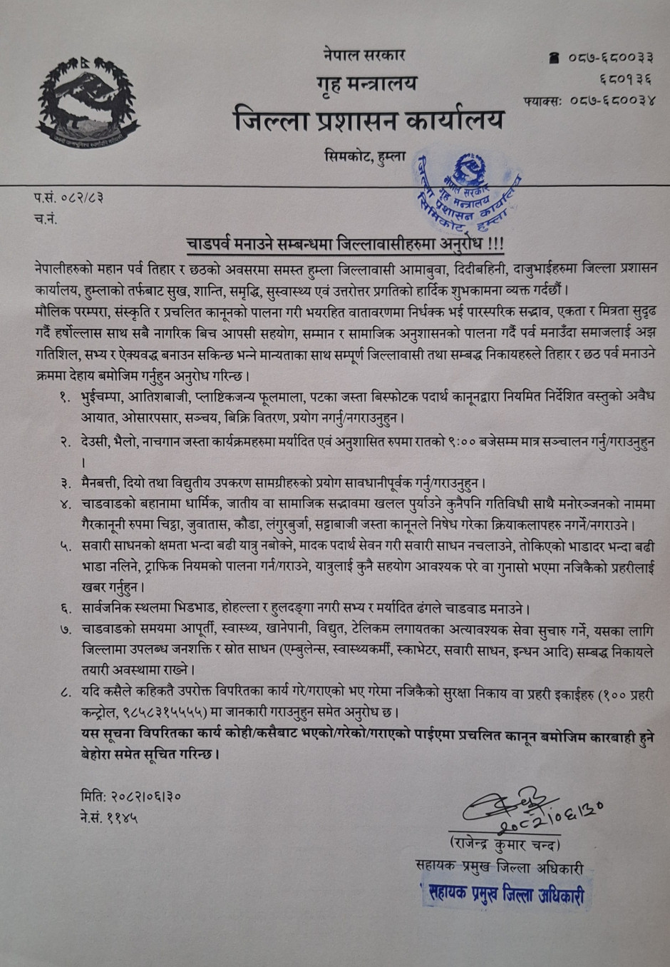 चाडपर्व मनाउने सम्बन्धमा जिल्लावासीहरुमा अनुरोध