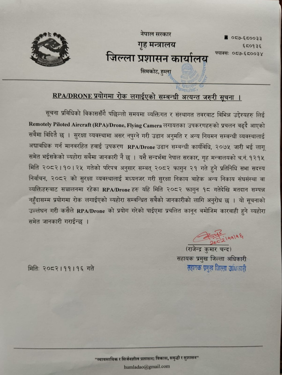RPA/Drone प्रयोगमा रोक लगाईएको सम्बन्धी अत्यन्त जरुरी सूचना ।
